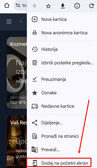 Za one koji ne znaju kako se to radi, uradite slijedeće: Na stranici na kojoj se nalazite kliknite na oznaku menija (tri tačkice u gornjem desnom uglu, vidite sliku ) a zatim u meniju koji se otvori kliknite na “Dodaj na početni ekran”, vidite sliku
