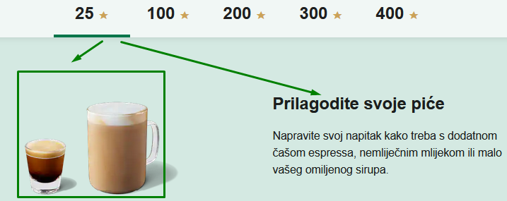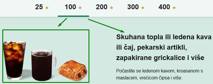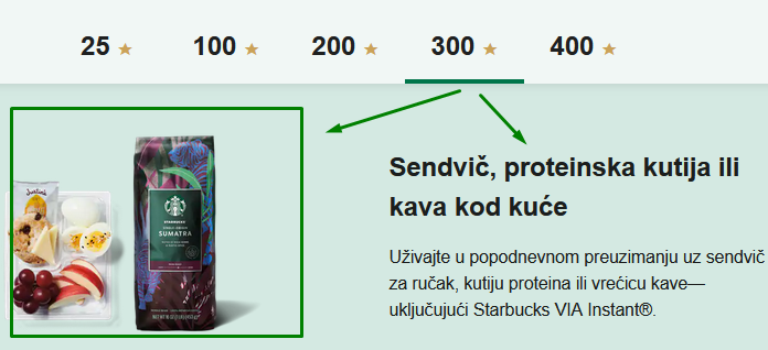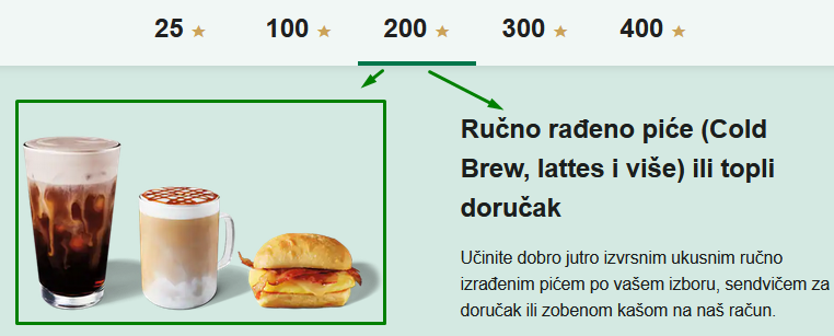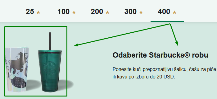 Dodatno, kupci dobijaju besplatne poslastice na njihove rođendane. Pogledajte koje nagrade svojim kupcima dodjeljuje Starbucks i koliko je “zvjezdica” potrebno sakupiti, tj.dolara potrošiti: