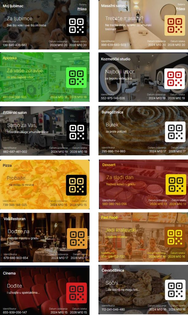 Pogledajte samo12 od mogućih nekoliko desetina kartica koje mogu biti istovremeno u vašem “Novčaniku”, a koje možete pogledati na demo platformi https://toployalty.net/bs-ba (trenutno 23 kartice kao demo):
