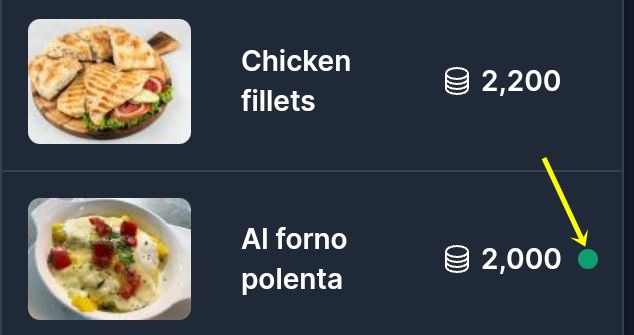 Each product for which there are enough points to claim a prize has a green dot, a sign that it can receive that prize.