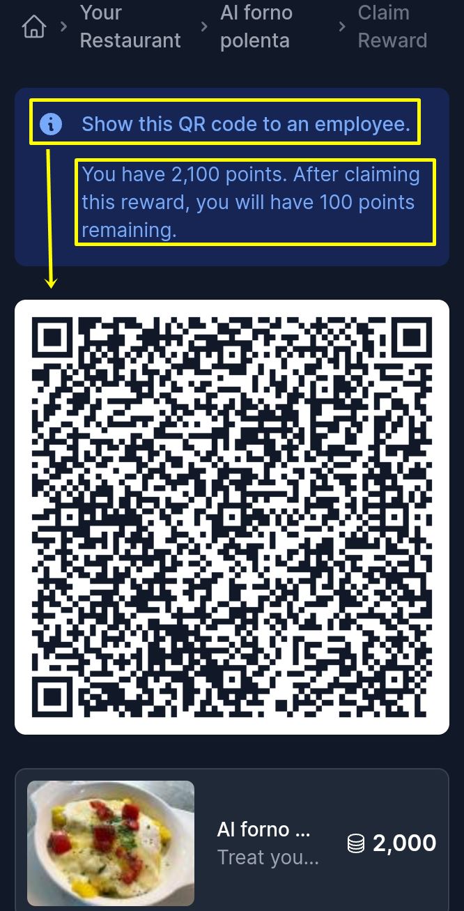 Kada korisnik želi preuzeti nagradu, klikne na taj proizvod, dobije ekran koji smo vidjeli na trećoj slici u dijelu ” Nagrade, Istorija, Pravila” na ovoj stranici, zatim klikne na “Zatražite nagradu” i na ekranu dobije QR kod koji pokaže nadležnoj osobi.